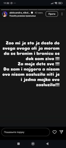 – Žao mi je što je došlo do svega ovoga ali ja moram da se branim i braniću se dok sam živa! Za moje dete sve! Da sam i najgora, a nisam ovo nisam zaslužila, niti je i jedna majka ovo zaslužila – poručila je Aleksanda.