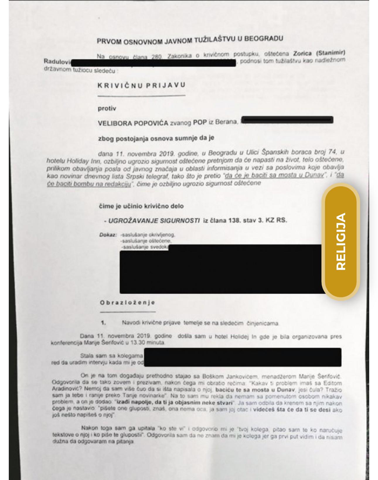 U krivičnoj prijavi se navodi i cela prepiska sa Veliborom Popovićem, koji joj preti da će je „baciti u Dunav“.