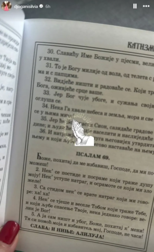 Silvija je na Instagramu podelila fotografiju na kojoj čita Psalam 69 iz Starog zaveta, tražeći utehu i snagu u molitvi.