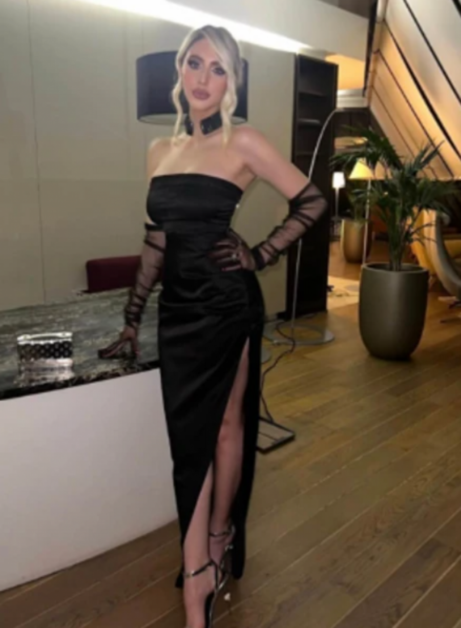 Na sebi je imala usku crnu haljinu s dubokim prorezom, a ovaj model joj je stajao kao saliven. Kao detalj odabrala je svilene rukavice koje su dosezale skoro do ramena, a celu kombinaciju upotpunila je i efektnom ogrlicom. Visoke zlatne potpetice dodatno su akcentovale njen izgled.