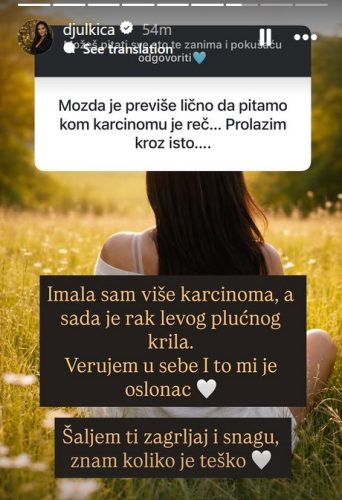– Imala sam karcinom, a sada je rak levog plućnog krila. Verujem u sebe i to mi je oslonac. Šaljem ti zagrljaj i snagu, znam koliko je teško – napisala je Đulkica emotivno i iskreno.