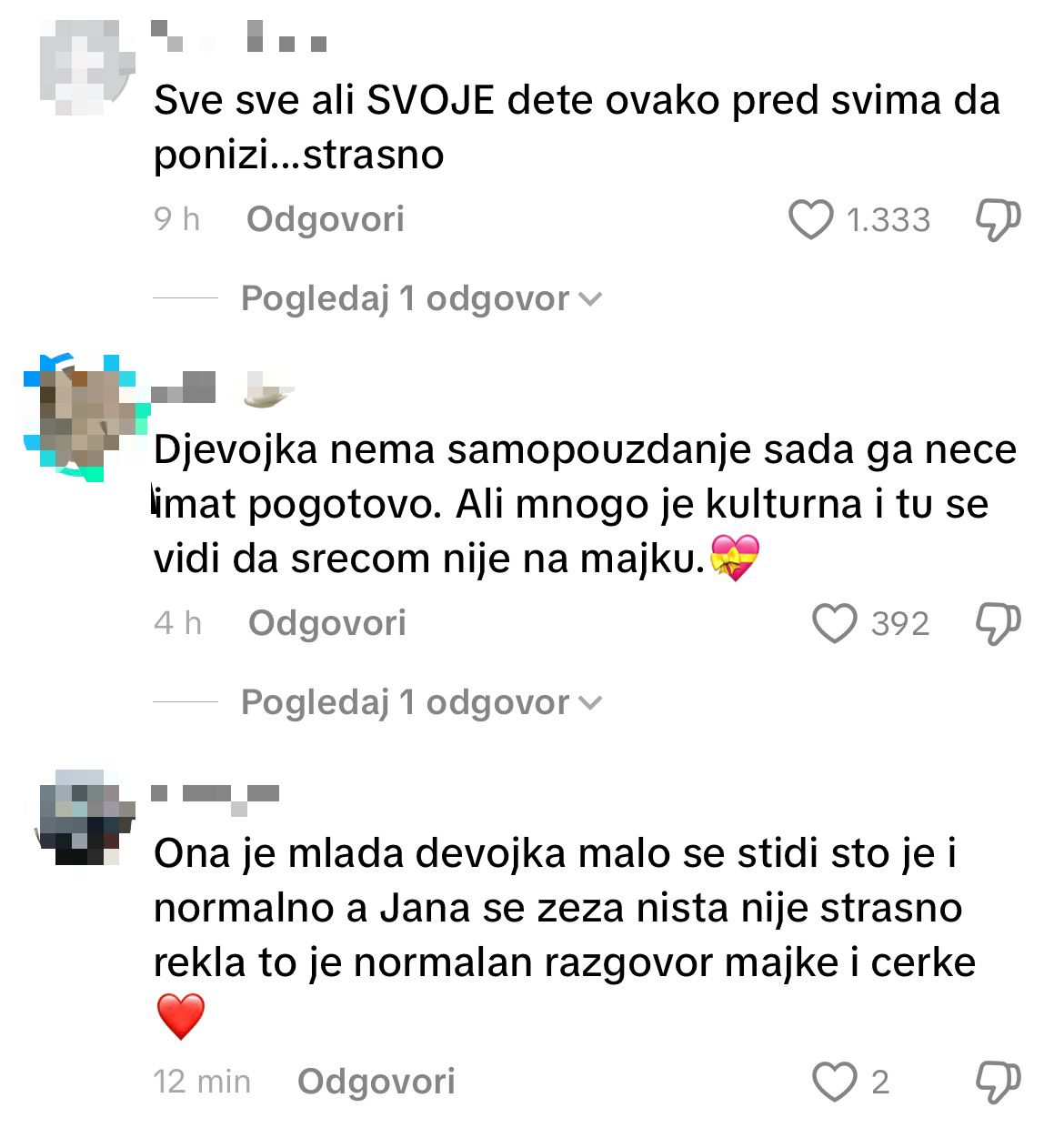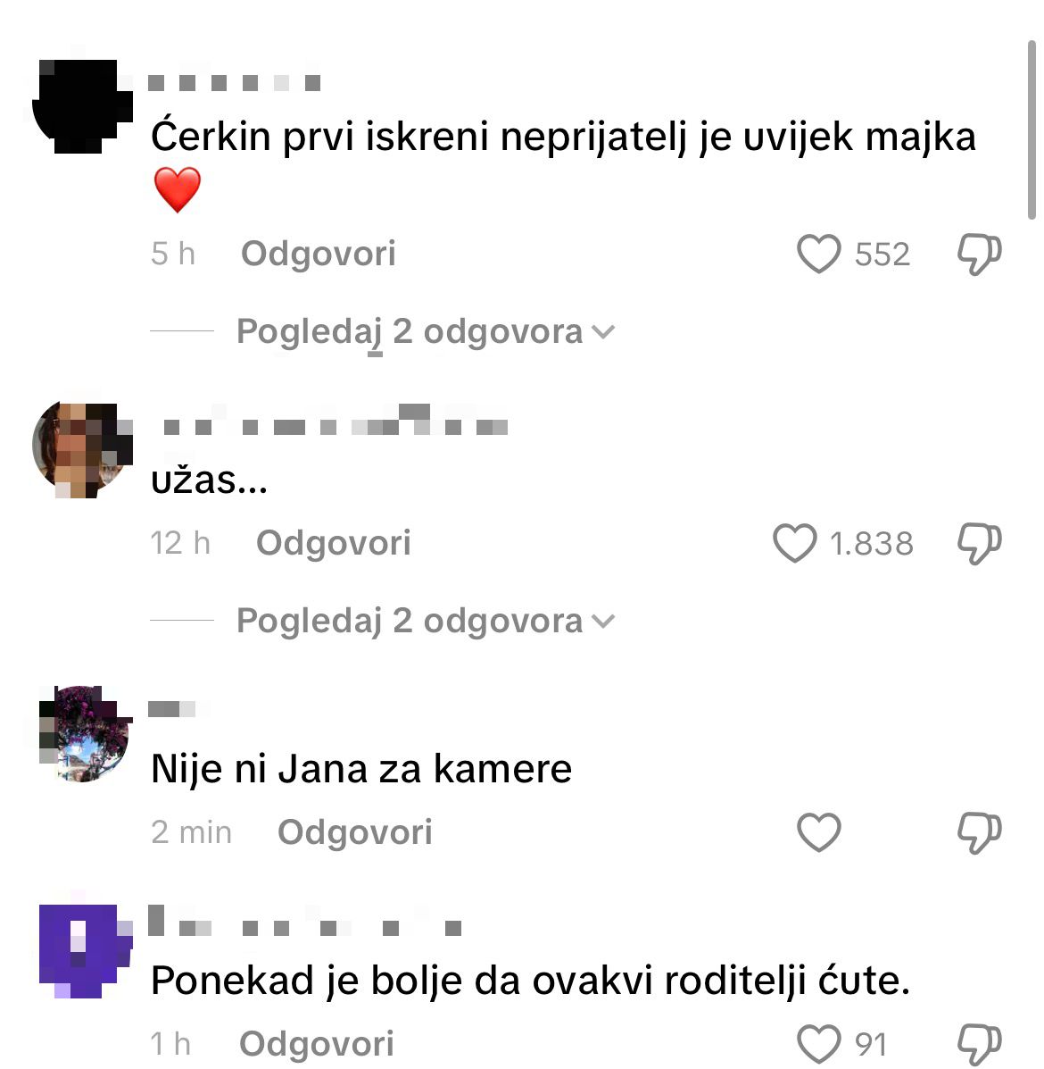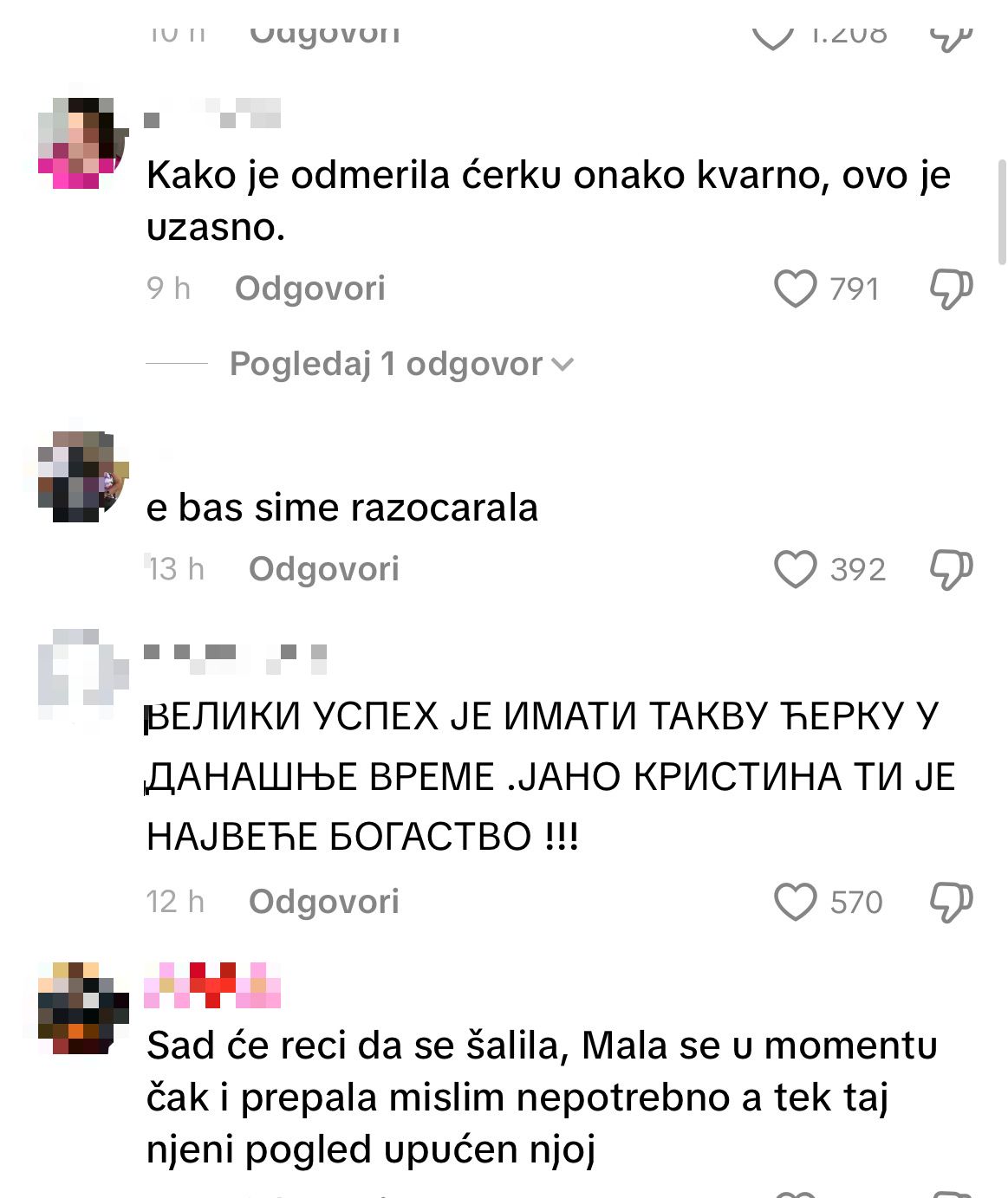 „Jel moguće ovo?“, „Koliko je odmerila ćerku onako kvarno, ovo je užasno“, „E baš mi se razočarala“, „Ćerkin prvi iskreni neprijatelj je uvek majka“,“Ponekad je bolje da ovakvi roditelji ćute“, „Nija ni Jana za kamere“,“Sve ali svoje dete ovako pred kamerama da ponozi strašno“ samo su neki od komentara.