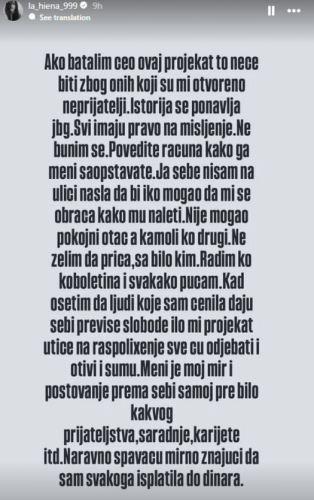 „Jako mi je žao zbog, stvarno divnih i pozitivnih, ljudi sa kojima sam imala interakciju sa ovog profila, što ću više vremena provoditi tamo. Jako sam povređena od strane ljudi, za koje bih do pre par sati bubreg dala. Situacija je još komplikovanija jer radimo zajedno. Zarad svog mira, biću odsutna par dana“, poručila je Ilićeva.