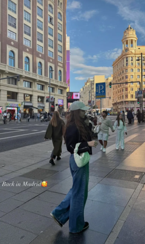 Čim je stigla u centar, uslikala se na ulici. Nosila je farmerke, crnu jaknu i kačket, a uz fotku je napisala: „Nazad u Madrid“.