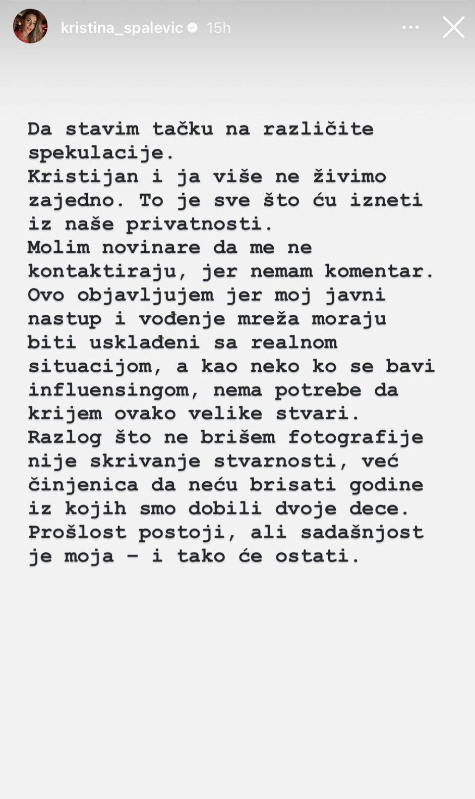 “Sve što sam imala da kažem, rekla sam na svom Instagram storiju. Na ovu temu više ne želim da dajem komentare. Moj fokus su moja deca i naš mir.”, rekla je Kristina za Hype tv.