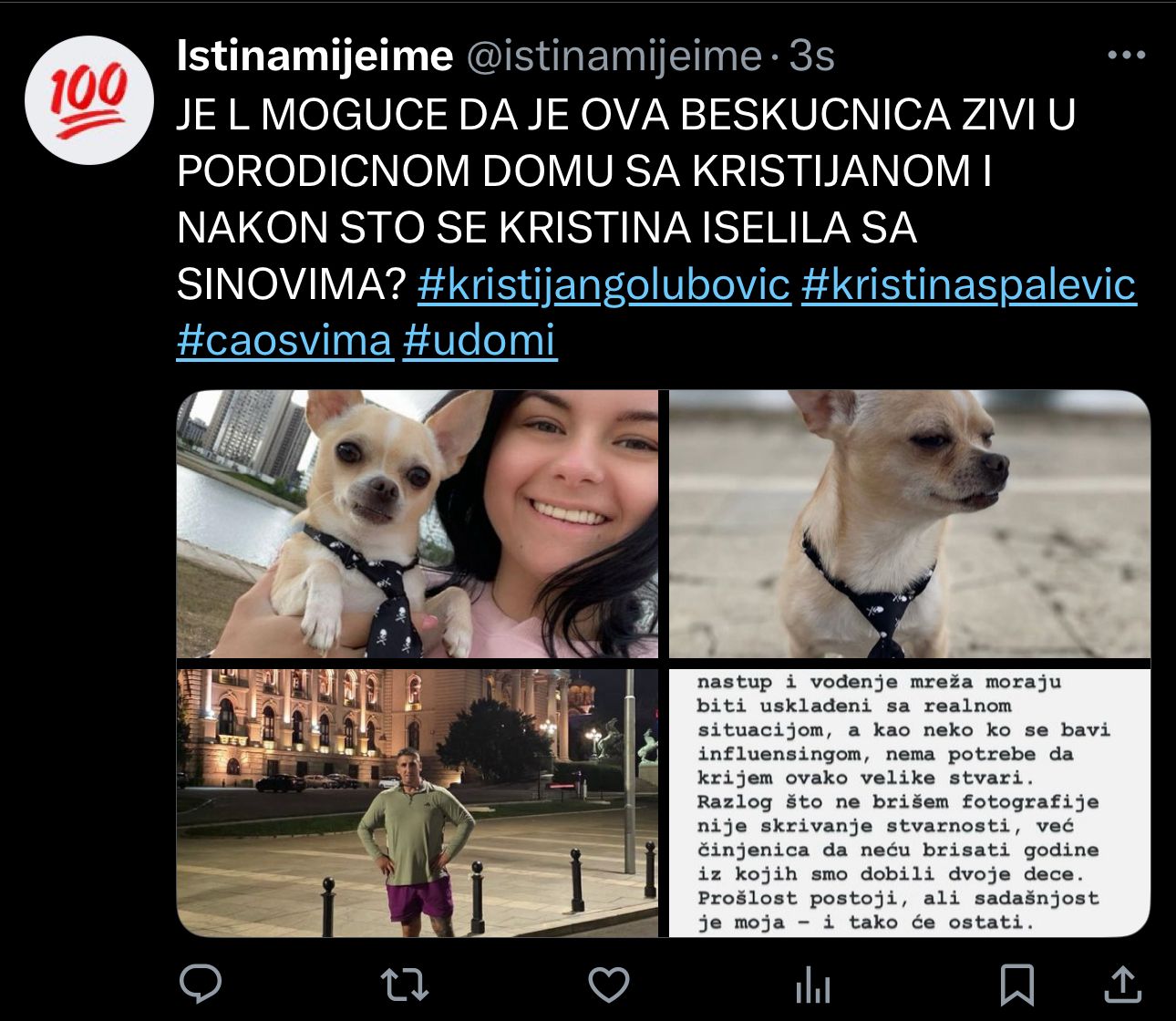 Na slici se jasno uočava detalj koji je fanove šokirao – pas ima istu kravatu koju je ranije nosio, a sada ga upravo ona oblači i drži, što je izazvalo lavinu komentara i spekulacija da ona sada i živi sa Kristijanom. I baš jer je isti pas sa istom kravatom i na Kristijanovom Instagram storiju.