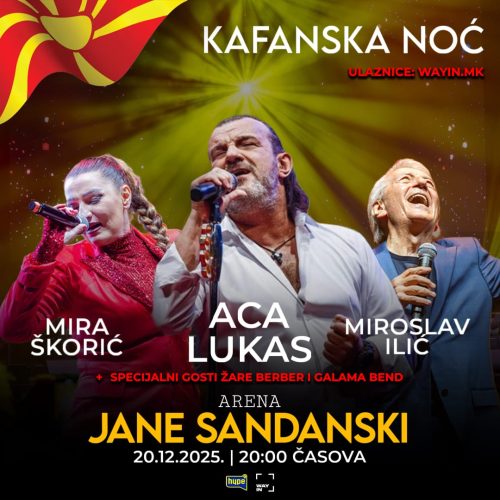 Arena „Jane Sandanski“ u Skoplju 20. decembra 2025. godine biće mesto prave muzičke čarolije, emocija i nezaboravne atmosfere! Publiku očekuje „Kafanska noć„, spektakl koji će okupiti najveće legende narodne i zabavne muzike Acu Lukasa, Miroslava Ilića i Miru Škorić.
