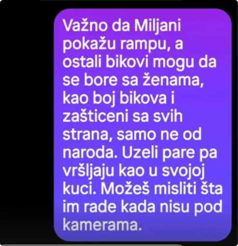 – Važno da Miljani pokažu rampu, a ostali bikovi mogu da se bore sa ženama, kao boj bikova, zaštićeni sa svih strana, samo ne od naroda. Uzeli pare pa vršljaju kao u svojoj kući. Možeš misliti šta im rade kada nisu pod pod kamerama – napisala je Marija.