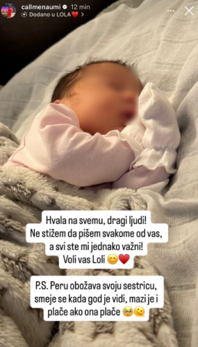 – Hvala na svemu dragi ljudi. Ne stižem da pišem svakome od vas, a svi ste mi jednako važni Voli vas Loli. P.S. Perun obožava svoju sestricu, smeje se kada god je vidi, mazi je i plače ako ona plače – napisala je ona.