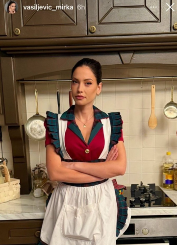 Naime, Mirka je na Instagramu podelila fotografiju iz kuhinje, obučena u kecelju i naslonjena na šporet. Jasno stavljajući do znanja da tumači lik kuvarice.