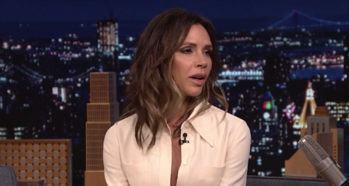 Umesto njenih uobičajenih „puddle“ pantalona, Victoria je nosila dugu usku suknju do članaka s visokim prorezom, koju je uparila s crnom bluzom s V-izrezom i peep-toe cipelama sa zakrivljenom štiklom.