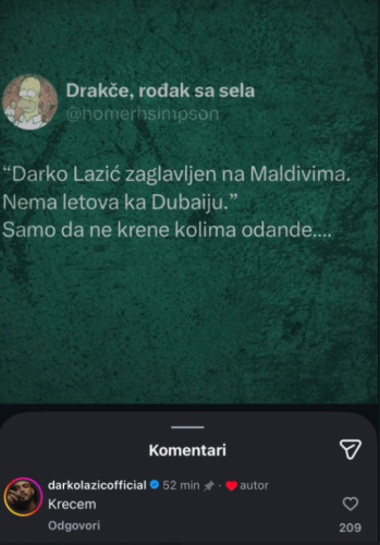 – „Darko Lazić zaglavljen na Maldivima, nema letova ka Dubaiju.“ Samo da ne krene kolima odande… – glasila je objava koju je pevač objavio na svom Instagram storiju, a u komentarima je kratko poručio: