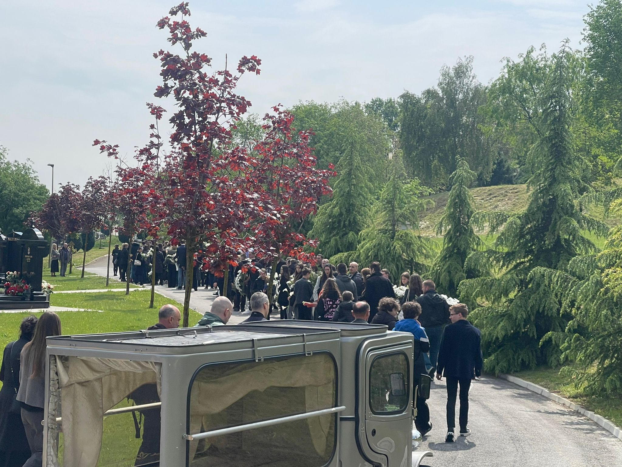 Sahrana dečaka A.Č. na groblju Lešće. Opelo je upravo počelo i drže ga dva sveštenika. U kapeli i ispred nje na…