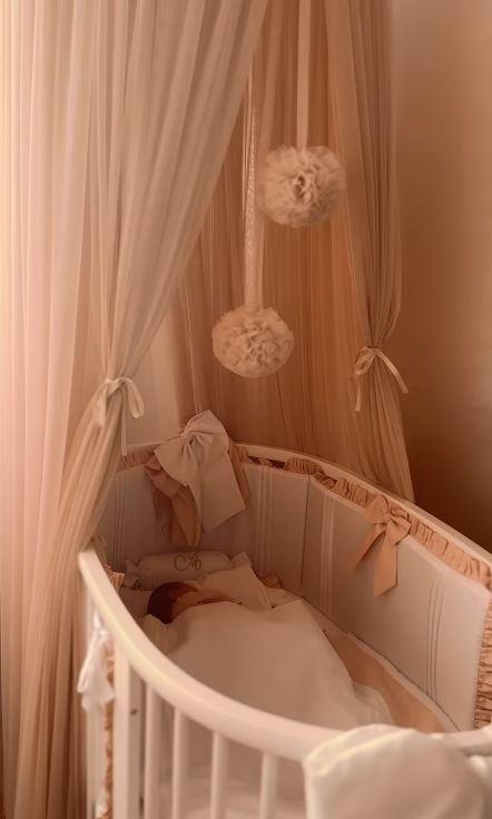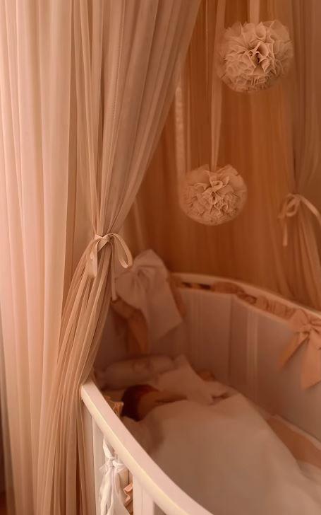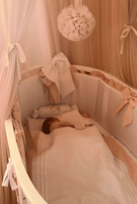 Sobica u nežno roze boji izgleda nalik onim iz svetskih magazina, a ponosna mama je pokazala i kolevku za mezimicu. Krevetac u obliku kolevke ukrašen je roze mašnama, a zaštićen je baldahinom u istoj boji.