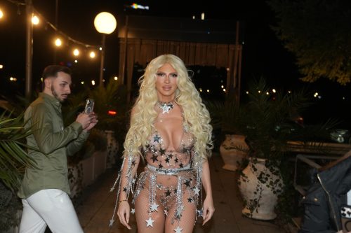 Jelena Karleuša se za večerašnji nastup u Beogradu pojavila u atraktivnom, futurističkom kostimu u srebrno-providnoj varijanti, ukrašenom zvezdama, kristalima i metalik detaljima koji su dodatno istakli njen scenski izgled. Stajling je upotpunila dugom, talasastom plavom kosom i efektnom šminkom.