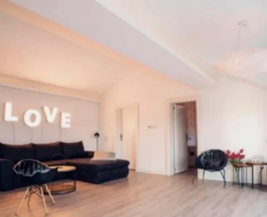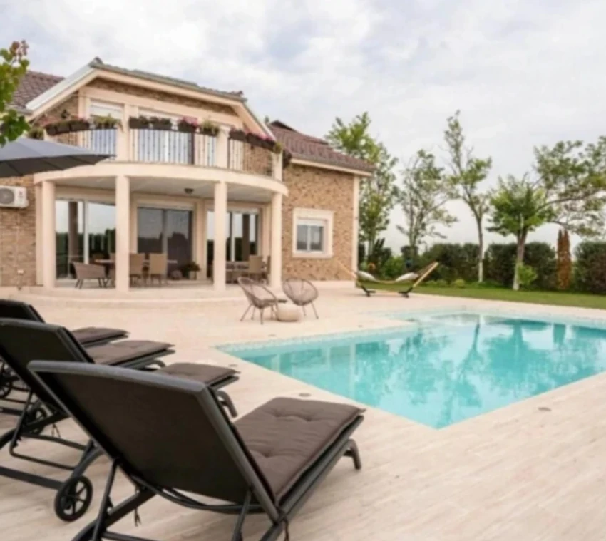 Oko bazena su postavljene ležaljke i fotelje, a vila poseduje dve velike dnevne sobe u kojima se nalaze unikatne garniture, veliki televizor, a zidovi su svetlih boja.
