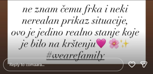 – Ne znam čemu frka i neki nerealan prikaz situacije, ovo je jedino realno stanje koje je bilo na krštenju. Mi smo porodica – navela je Milica u opisu objave.