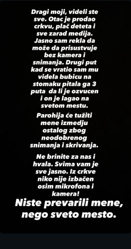 – Dragi moji, videli ste sve. Otac je prodao crkvu, plač deteta i sve zarad medija. Jasno sam rekla da može da prisustvuje bez kamera i snimanja. Drugi put kad se vratio sam mu videla bubicu na stomaku pitala ga 3 puta da li je ozvucen i on je lagao na svetom mestu. Parohija će tužiti mene izmedju ostalog zbog neodobrenog snimanja i skrivanja. Ne brinite za nas i hvala. Svima vam je sve jasno. Iz crkve niko nije izbačen osim mikrofona i kamera! Niste prevarili mene, nego sveto mesto -napisala je Milica na svom instagram nalogu.