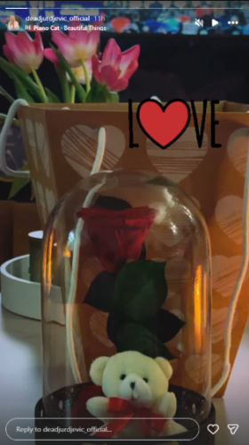 Na društvenim mrežama objavila je fotografiju crvene ruže i plišanog medvedića, smeštenih u staklenoj, poklopljenoj vazi, simbolizujući nežnost i posebne trenutke u trudnoći.