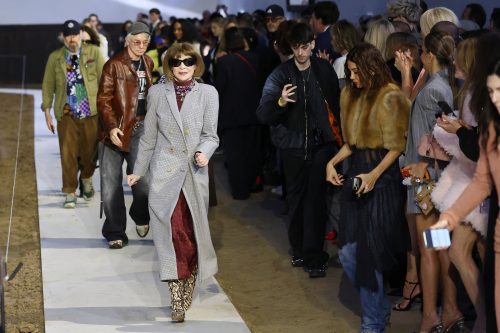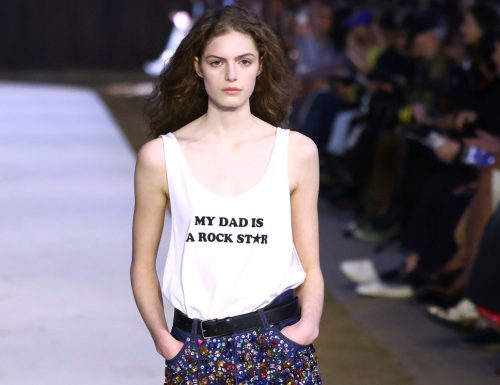Čuvena dizajnerka izgledala je elegantno u oversajz sivom odelu i beloj košulji, a ocu je uzvratila pažnju tako što je poslednji model koji je prošetao pistom nosio majicu sa natpisom “Moj tata je rok zvezda”.