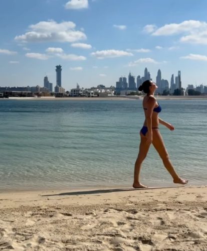 U narednim objavama pokazala je i selfi dok se sunčala, sa fokusom na grudi, dok je kasnije prošetala plažom i istakla zategnute noge i zadnjicu.
