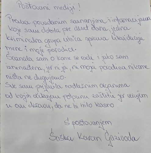 „Prema pouzdanim saznanjima i informacijama koje sam dobila pre deset dana, jedna kriminalna grupa ubica sprema likvidaciju mene i moje porodice. Saznala sam o kome se radi i jako sam iznenađena, jer ni ja ni moja porodica nikome ništa ne dugujemo. Sve sam prijavila nadležnim organima, od kojih očekujem potpunu zaštitu, jer verujem u ovu državu, da ne bi bilo kasno. „, navela je pevačica.