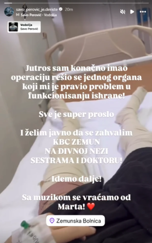 – I želim javno da se zahvalim KBC Zemun na divnoj nezi sestrama i doktoru! Idemo dalje! Sa muzikom se vraćamo od marta – dodao je Savo Perović.
