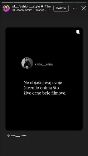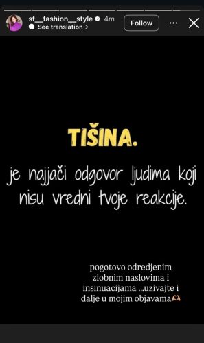 Uz ove poruke, bivša supruga pevača dodala je komentar: „Pogotovo određenim zlobnim naslovima i insinuacijama. Uživajte i dalje u mojim storijima“, prateći ga emotikonom srca.