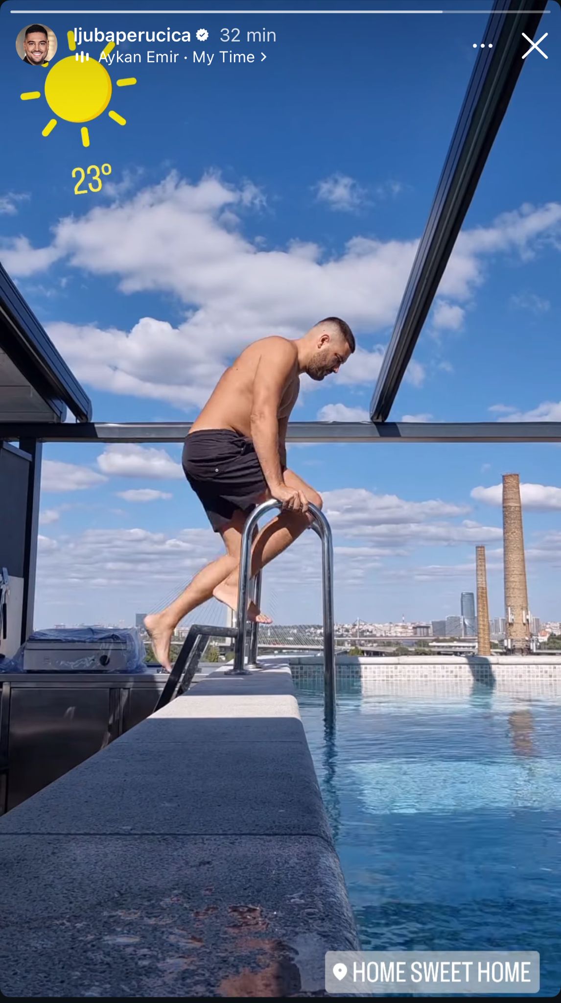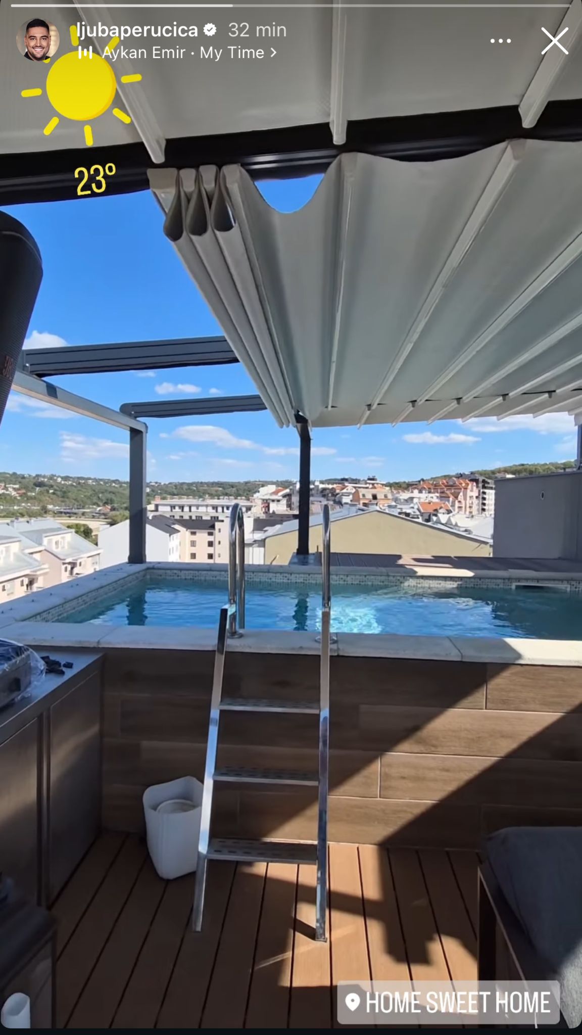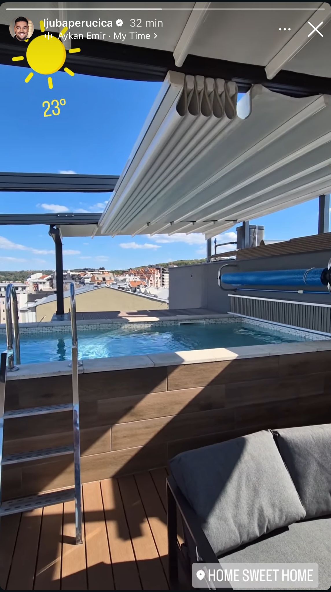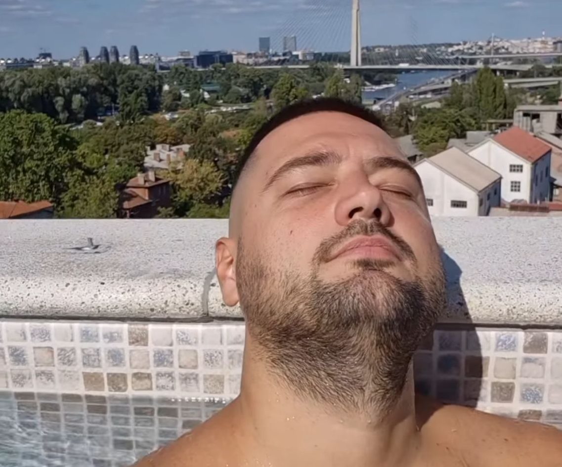Tom prilikom je pokazao i svoju terasu, sa koje se pruža pogled na skoro pola Beograda. Zatim je sam uskočio u bazen kako bi se osvežio i opustio, a sve je dokumentovao na Instagramu.