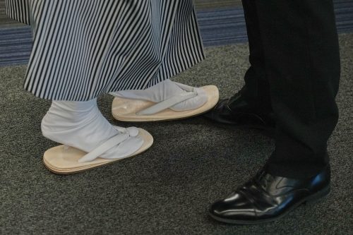 Dva mladića stoje jedan pored drugog, jedan u tradicionalnim zori sandalama i tabi čarapama, a drugi u elegantnim cipelama, razgovaraju pre proslave Dana odrastanja, vekovne tradicije i nacionalnog praznika koji predstavlja prekretnicu od detinjstva do odraslog doba.