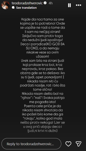-Nikada nisam delila bol na “njihov” i “naš”! Svaka patnja me pogađa isto! Poenta cele priče je da nikada nisam shvatala da iko poželi bilo kome da ga „rokaju“, koliko god imala nešto protiv nekoga! (Jer se u ovoj priči ubijaju deca i ljudi, ni krivi ni dužni) – napisala je vidno uznemirena Teodora.