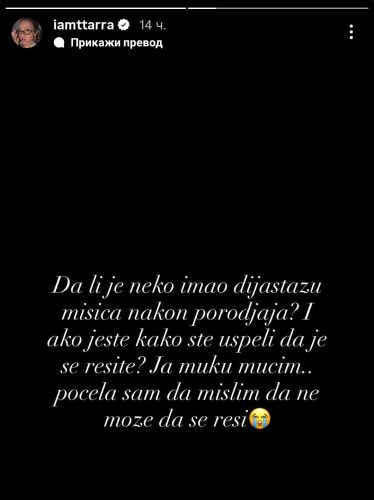 -Da li je neko imao dijastazu mišića nakon porođaja? I ako jeste kako ste uspele da je se rešite? Ja muku mučim… Počela sam da mislim da ne može da se reši- napisala je kao objavu na svom Instagram storiju i propratila uplakanim emotikonom.
