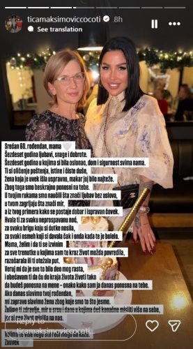 – Srećan 60. rođendan, mama. Šezdeset godina ljubavi, snage i dobrote. Šezdeset godina u kojima si bila oslonac, dom i sigurnost svima nama. Ti si oličenje poštenja, istine i čiste duše, žena koja je uvek išla uspravno, makar joj bilo najteže. Zbog toga smo beskrajno ponosni na tebe. U tvojim rukama smo naučili šta znači ljubav bez uslova, u tvom zagrljaju šta znači mir, a iz tvog primera kako se postaje dobar i ispravan čovek.