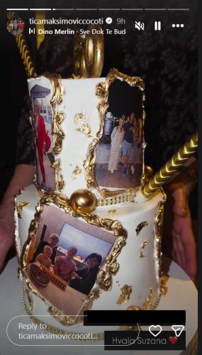 Pažnju gostiju privukla je i raskošna torta na dva sprata. Elegantna bela torta sa zlatnim detaljima bila je ukrašena perlama, dekorativnim kuglicama i ramovima, a poseban emotivni pečat dale su porodične fotografije. Na torti su se nalazile zajedničke slike Tijane i njene majke, ali i ostalih članova porodice, dok su na samom vrhu dominirale zlatne cifre 60, kao simbol velikog i značajnog jubileja.