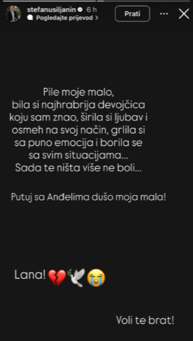– Pile moje malo, bila si najhrabrija devojčica koju sam znao, širila si ljubav i osmeh na svoj način. Grlila si se sa puno emocija i borila se sa svim situacijima. Sada te ništa više ne boli.  Putuj sa Anđelima dušo moja mala – napisao je Stefan i dodao: