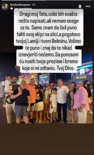 – Dragi moj tata, voleo bih svašta nešto napisati, ali nemam snage za to. Samo znam da ćeš puno faliti ovoj ekipi na fotografiji, a pogotovu tvojoj Lamiji i tvom Belminu – napisao je Dino.